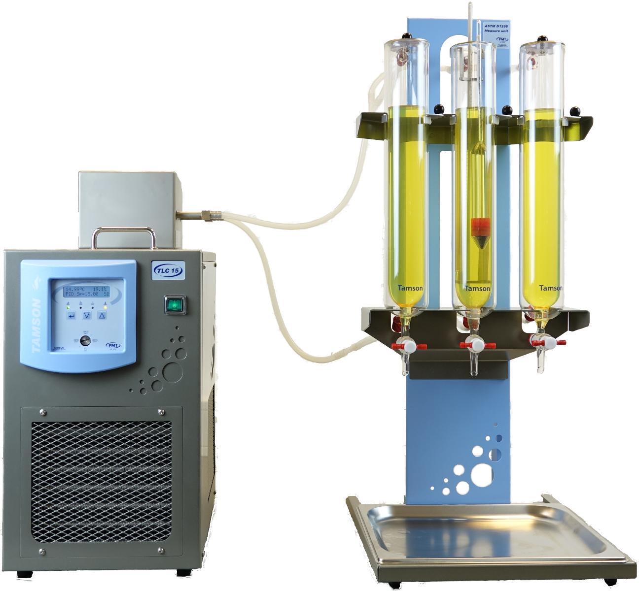 El aparato de densidad Tamson ASTM D1298 es un aparato para determinar la densidad de productos derivados del petróleo mediante un hidrómetro. El aparato consta del circulador de enfriamiento Tamson TLC15-5 y un bastidor con cilindros encamisados para mantener las muestras a las temperaturas deseadas. El aparato tiene tres posiciones y se puede ampliar opcionalmente a un aparato de seis posiciones. ASTM D1298