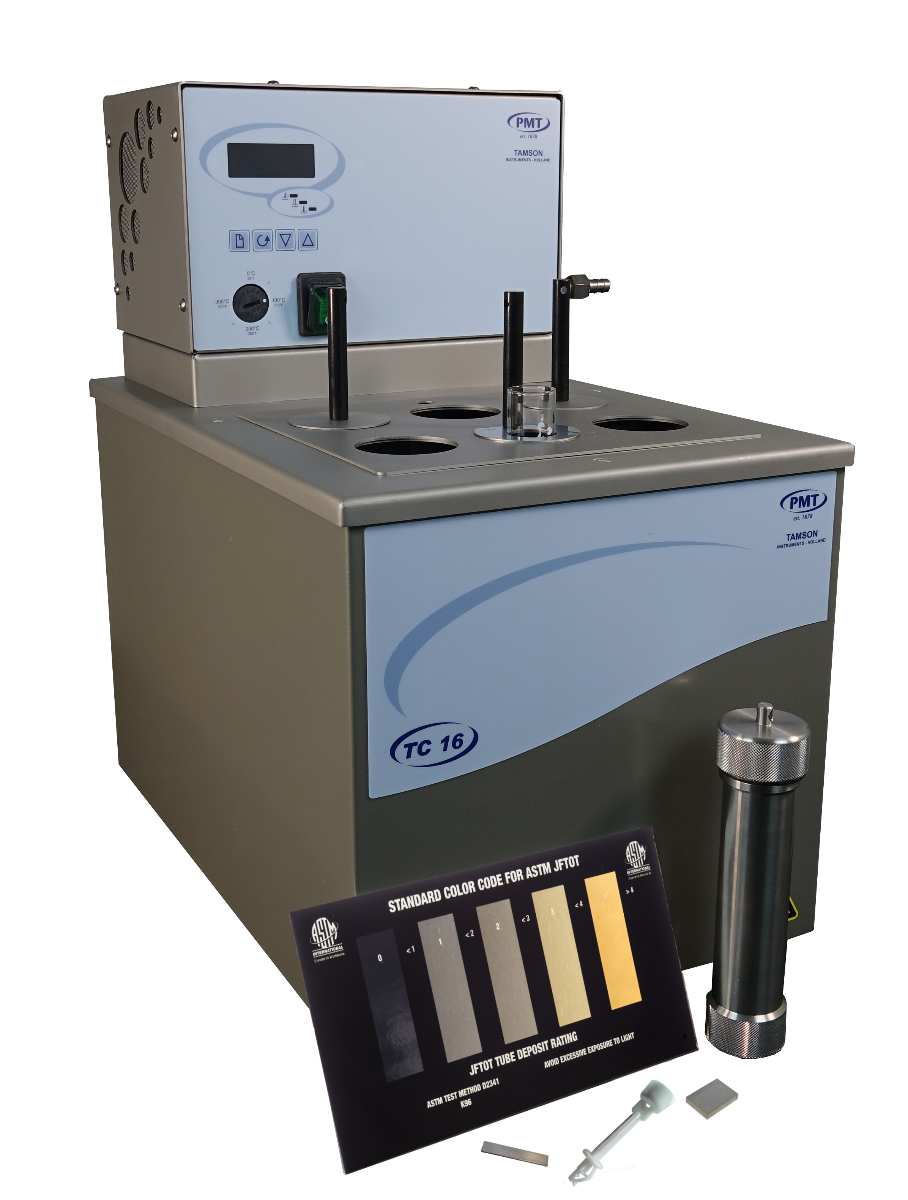 Este método de ensayo especifica la determinación de las tendencias corrosivas hacia la plata del combustible para turbinas de aviación, aceites para motores de encendido por chispa para automóviles o gasolina para automóviles. El resultado se clasifica como un número entero en el rango de 0 a 4. El baño ofrece espacio para seis posiciones de prueba. El rango de temperatura va desde la temperatura ambiente +5 °C hasta los 250 °C. Opcionalmente, hay una tapa con nueve orificios para probar nueve muestras (P/N 03T2313).