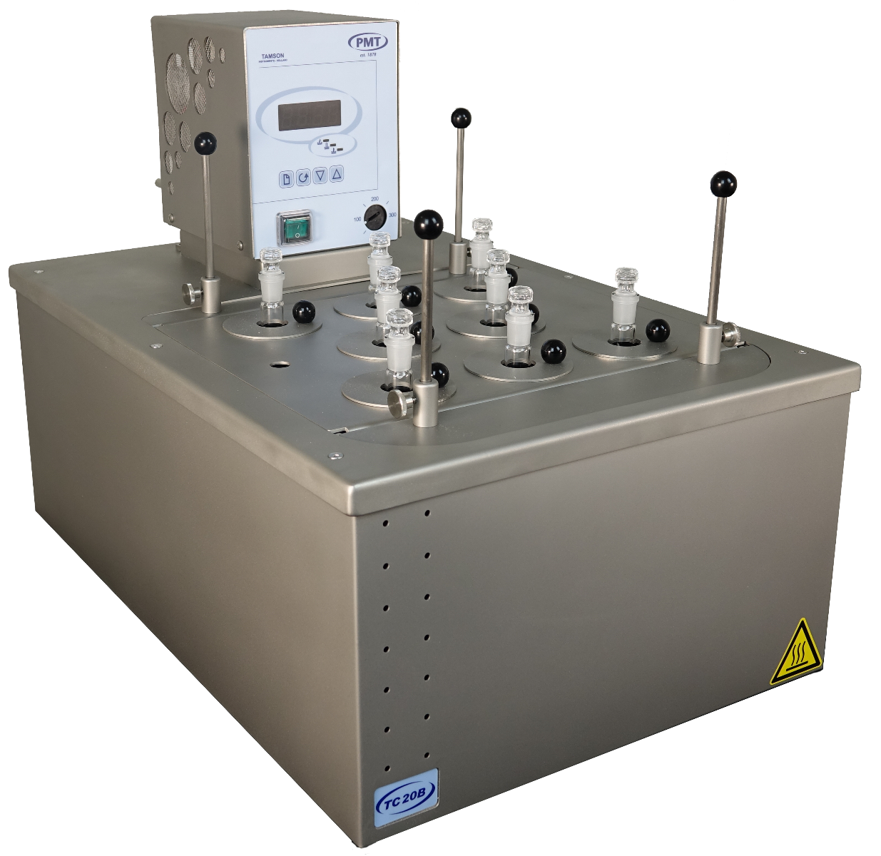 Baño de temperatura constante ASTM D3231. El baño puede contener ocho matraces volumétricos sumergidos hasta la marca. La temperatura necesaria para el método de prueba está entre 82,2 °C y 87,8 °C. El TC20B se puede utilizar como circulador o baño. El fluido del baño se calienta a través de un elemento calefactor controlado por microprocesador. Cuando se trabaja por debajo de la temperatura ambiente, se puede hacer circular fluido refrigerante a través del serpentín de enfriamiento para reducir la temperatura del baño. El baño está equipado con detección de nivel de fluido. El calentamiento controlado por microprocesador con función de ajuste automático garantiza un control preciso de la temperatura. La temperatura del baño se puede ajustar a un máximo de 200 °C (392 °F) en pasos de 0,1 grados. La precisión general del sistema es de ±0,02 °K. Se incluye una tapa superior. El baño cumple con la normativa CE.