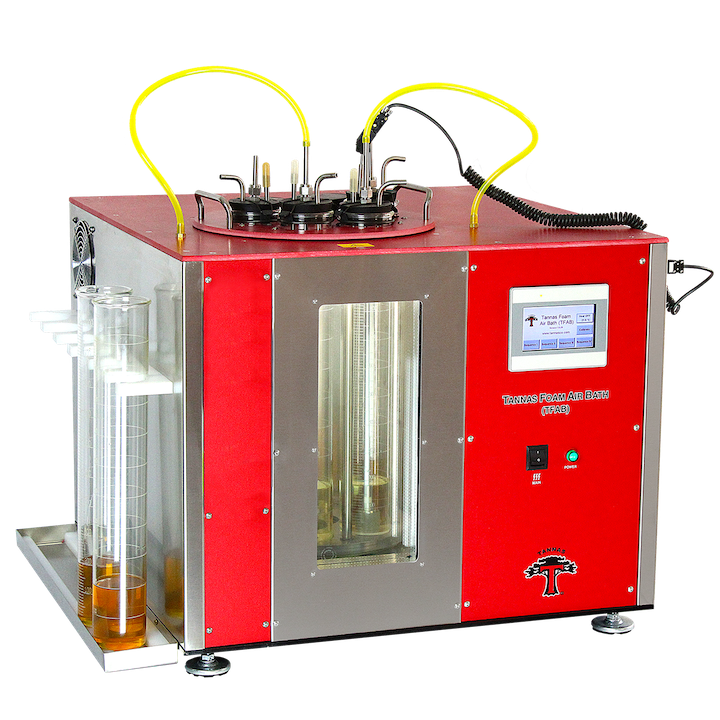 La alta tendencia a la formación de espuma y el lento tiempo de colapso de la espuma son dos respuestas indeseables de los aceites de motor y los fluidos hidráulicos que pueden provocar fallas mecánicas. El TFAB mide la tendencia y estabilidad de la eficacia de los aditivos de espuma en aceites y lubricantes en un amplio rango de temperaturas (24°C a 150°C). El enfoque de baño de aire único del TFAB reduce drásticamente los requisitos de espacio en la mesa de trabajo, elimina la necesidad de reemplazar el aceite de baño oxidado (decolorado), permite una mayor precisión en la lectura de los niveles de espuma y reduce significativamente los riesgos de secuencias operativas de temperaturas más altas. El TFAB ha mostrado correlación en estudios round robin de ASTM y ha ayudado en los esfuerzos de ASTM para mejorar la precisión del método de prueba.